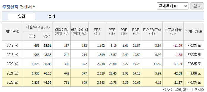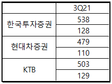 각 증권회사의 21년3Q 추정 실적은 매출500억원 영업이익 120억원 정도로 추정된다.